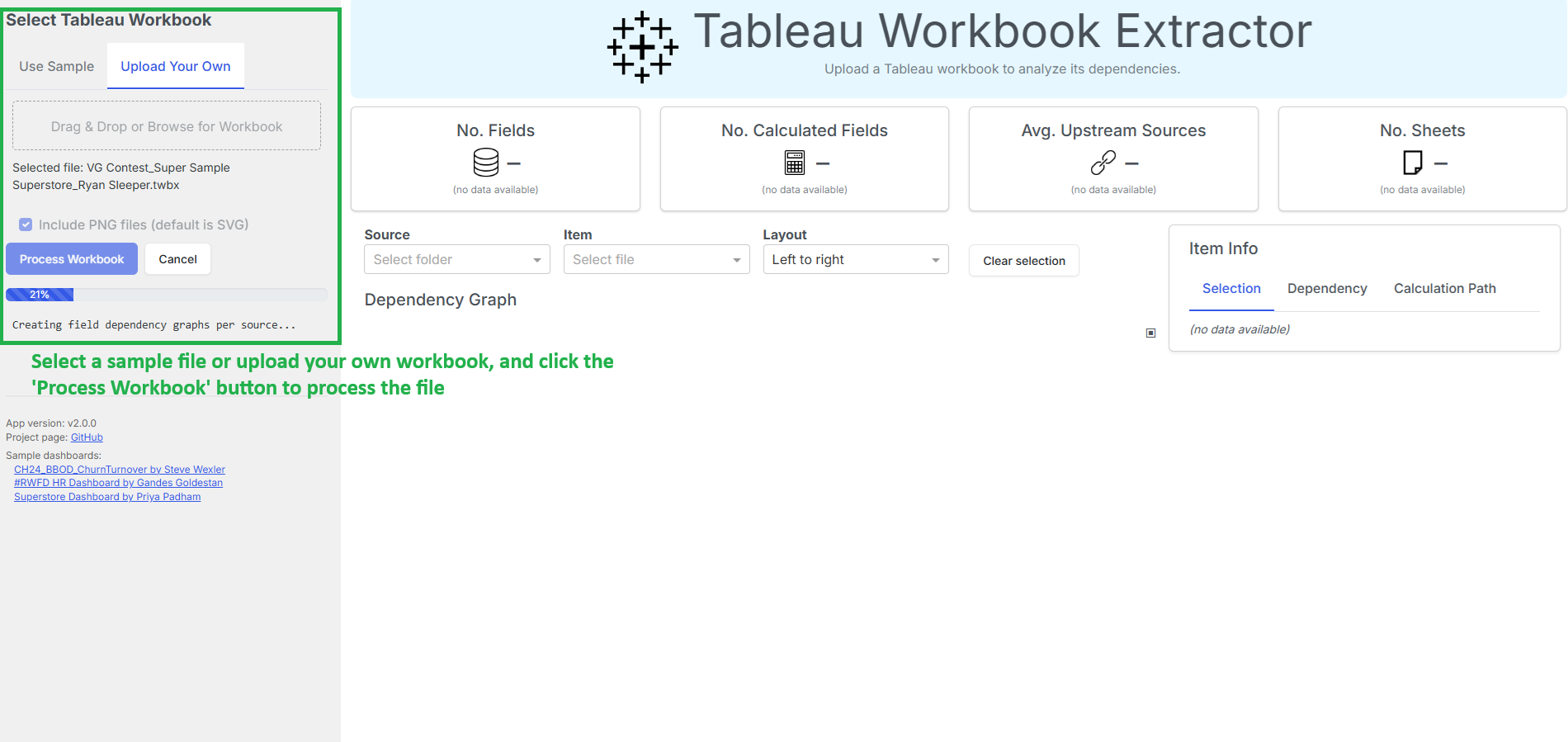This provides the same functionality as the web version, allowing you to upload Tableau workbooks, process them, and download the results—without relying on an external deployment like Render.
